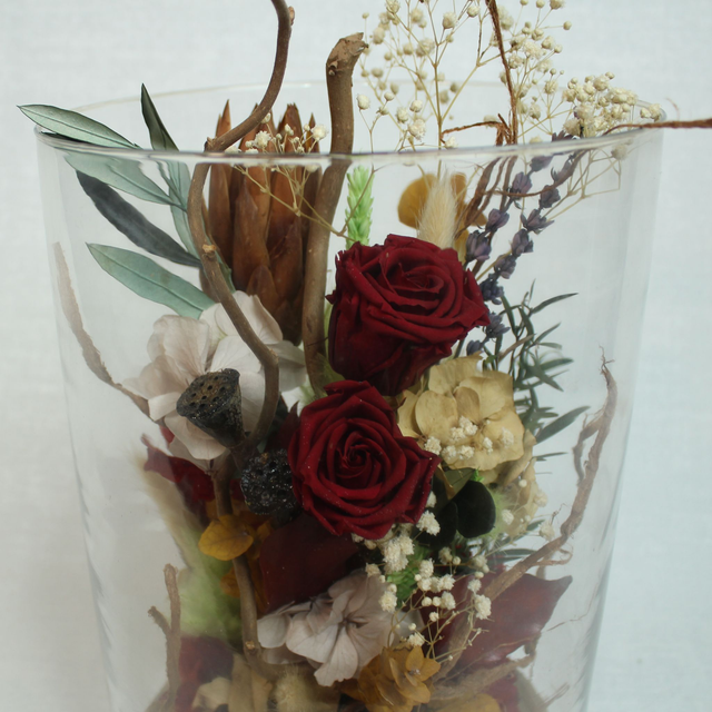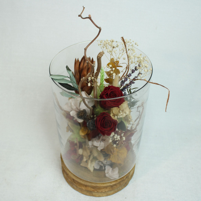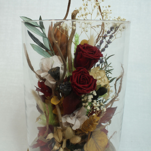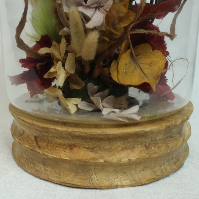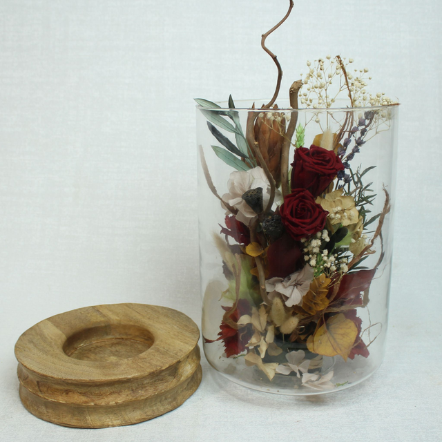 Pieza exclusiva con base de madera maciza y cristal encajado. Flofer y ramajes preservados con ramas de avellano y protea.