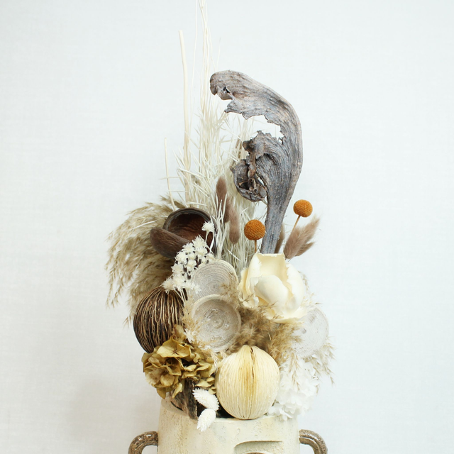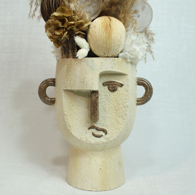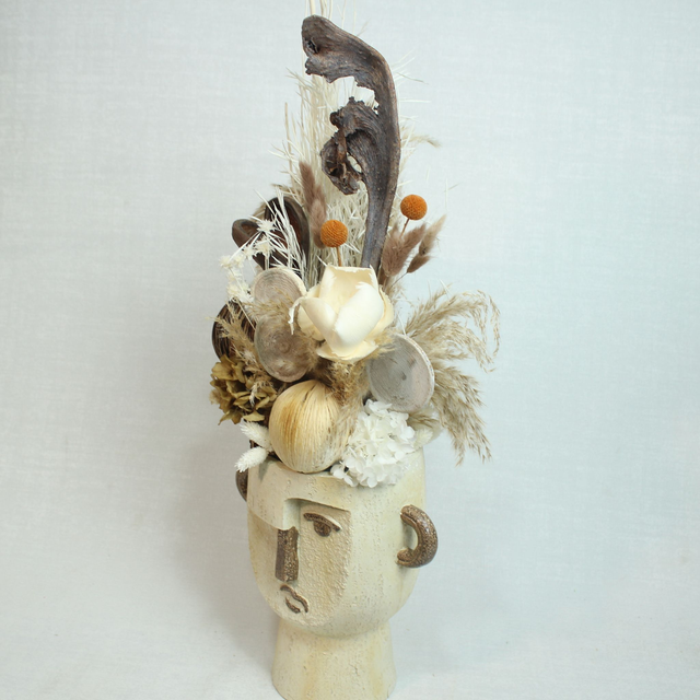 Cabeza cubista color crema y chocolate. Arreglo con frutos secos y maderas, hortensia preservada y craspedias.