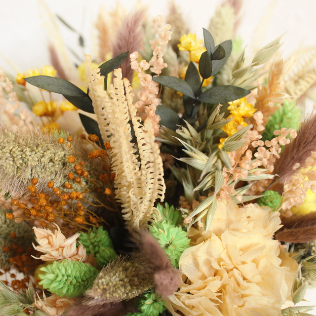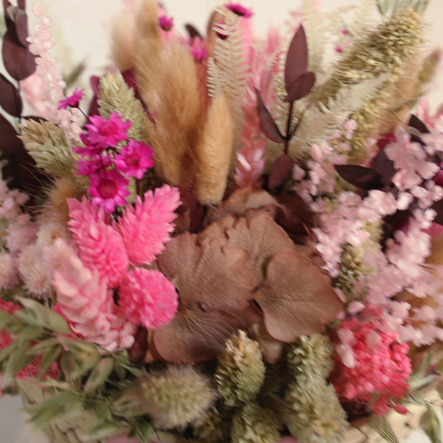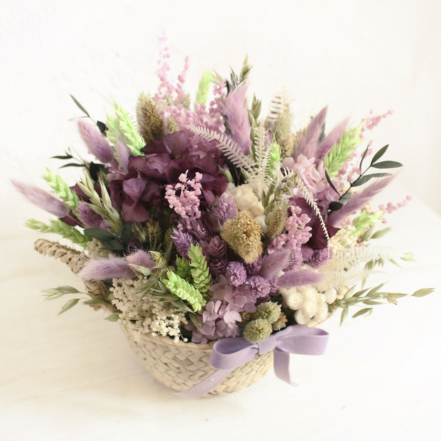 Capacito combinando flores secas y preservadas. Con detalle de rosita eterna. MEDIDAS: 24x24cm