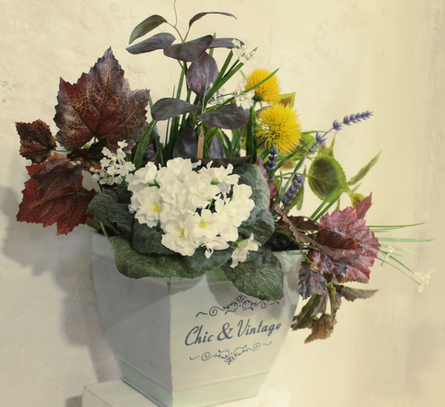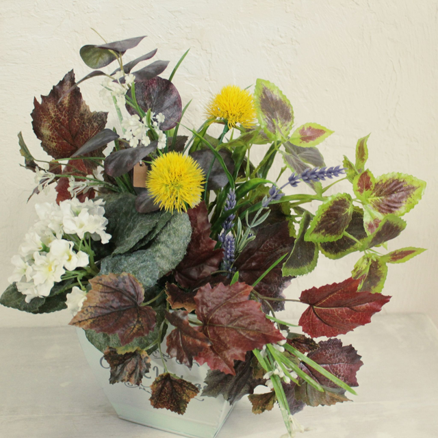Zinc en colores pasteles. Plantas artificiales como coleos, maple, hortensia, lavanda, flor de castaña... MEDIDA Alt43cm x 40cm