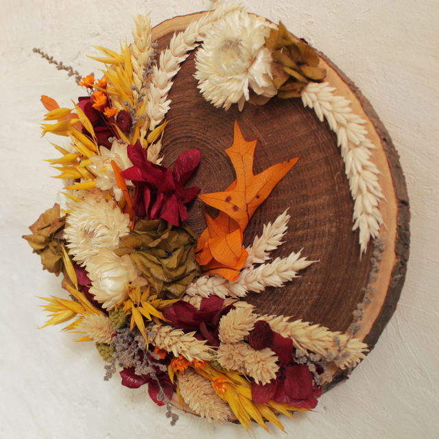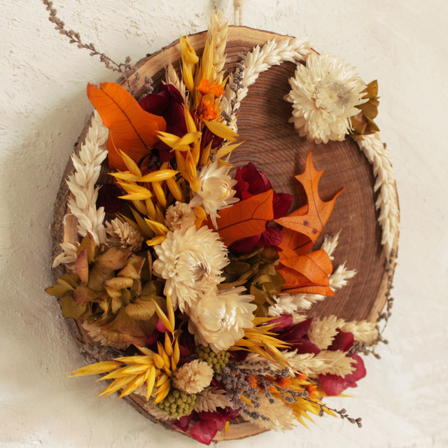 Rodaja con aplique para colgar. Flores secas amarillo, burdeos y blanco. D20cm