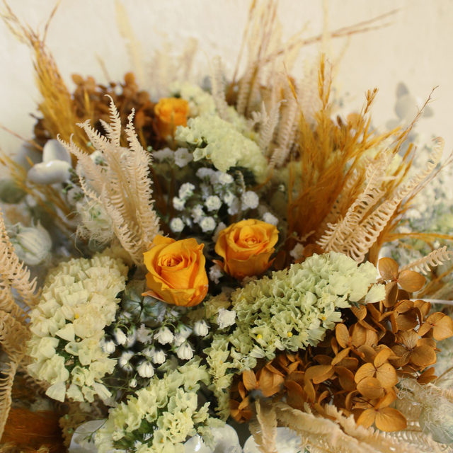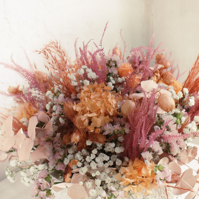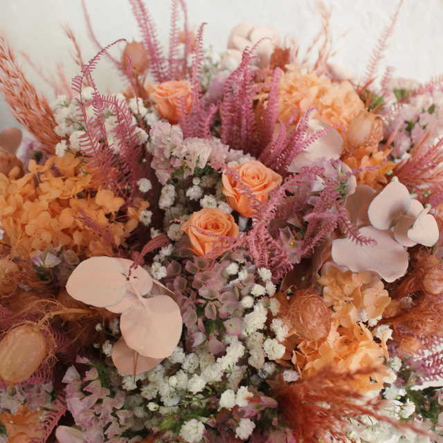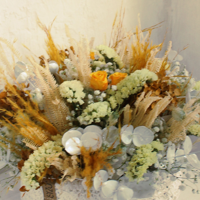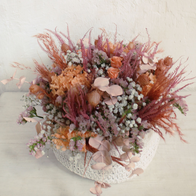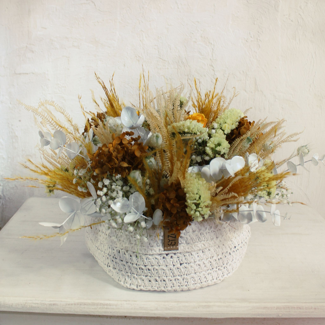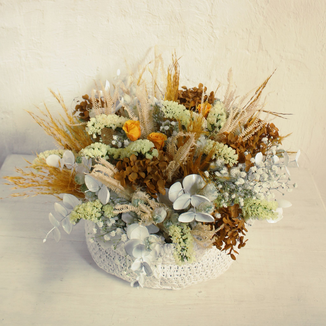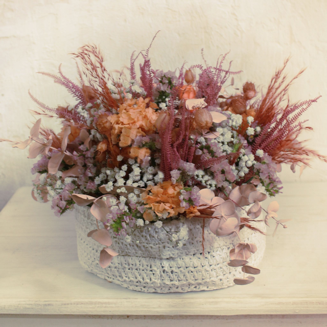 Base de tejido SIZO blanca. Flores preservadas y secas. Siempreviva, gypsophila...