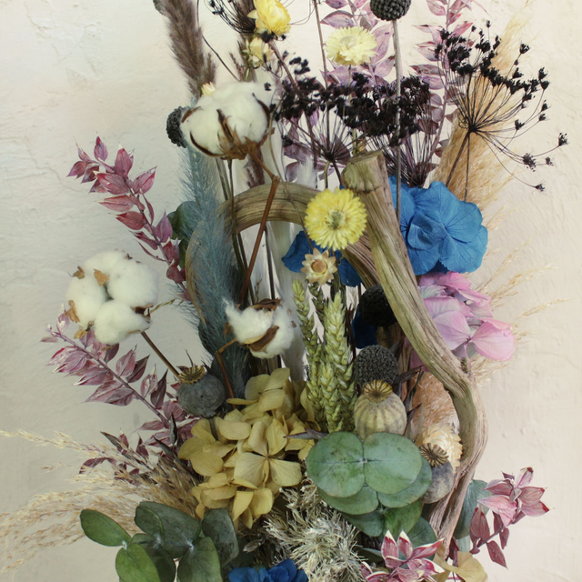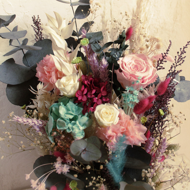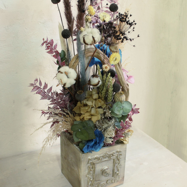Caja de madera cuadrada. Arreglo Hortensias y flores preservadas. MEDIDA Alt65cm x 35cm