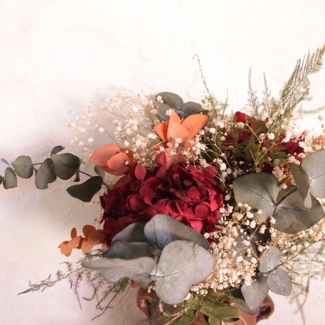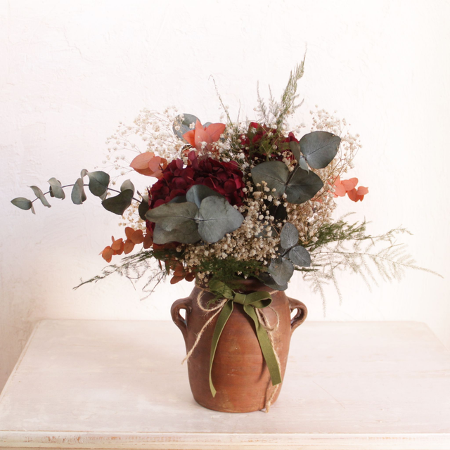 Tinaja marrón. Preservados: Eucaliptos, gypsophila, esparraguera, hortensia. MEDIDA: Alt 35 x D30cm
