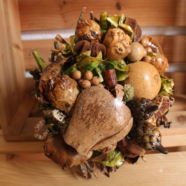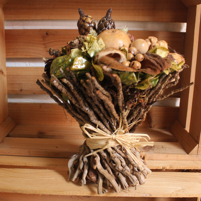 Bouquet con pequeños troncos y elementos naturales rústicos. Tonos naturales.